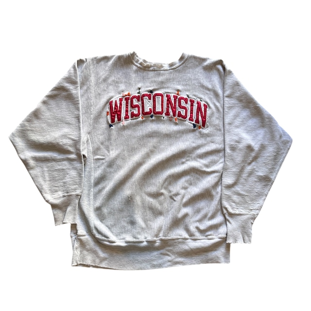 90's champion R.W sweatshirt Brand: champion Size: XL 実寸 着丈69cm 身幅57cm 肩幅50cm 袖丈62cm Made in MEXICO 90年代チャンピオンリバースウィーブ。 WISCONSINのワッペンが付いた1着。 全体的にダメージやリペア跡、シミなどがあります。 着用には問題なく雰囲気系としていかがでしょうか。 年代物になりますので神経質な方はご理解の程よろしくお願い致します。 写真と実際の色合いは若干異なります。