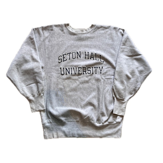90's Champion Reverse Weave sweatshirt Brand: Champion Size: XL 実寸 着丈 69cm 身幅 59cm 肩幅 50cm 袖丈61cm Made in USA 90年代のカレッジスウェット。 SETON HALL大学のプリントがされた1着。 プリントにヒビなどあります。 襟にダメージがあり小さなシミが少しあります。全体的に着込まれており柔らかい質感になっています。 年代物になりますので神経質な方などはご理解のほどよろしくお願い致します。 写真と実際の色合いは若干異なります。