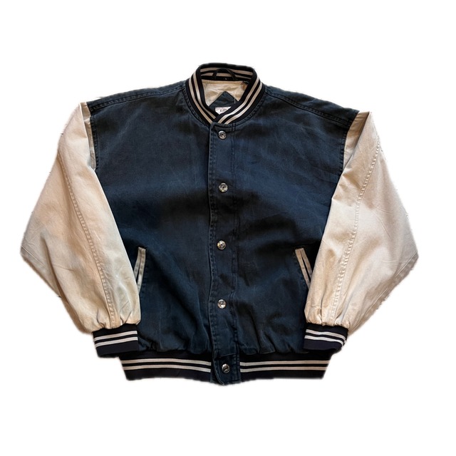 90's Cotton JKT Brand: Size:L 実寸 着丈 72cm 身幅 66cm 肩幅 61cm 袖丈 59cm ブラック×ベージュの切り替えしコットンジャケット。 スナップボタンでスタジャンタイプです。 両袖に薄ら目立ちにくいシミがあります。 年代物になりますので神経質な方などはご理解のほどよろしくお願い致します。 写真と実際の色合いは若干異なります。