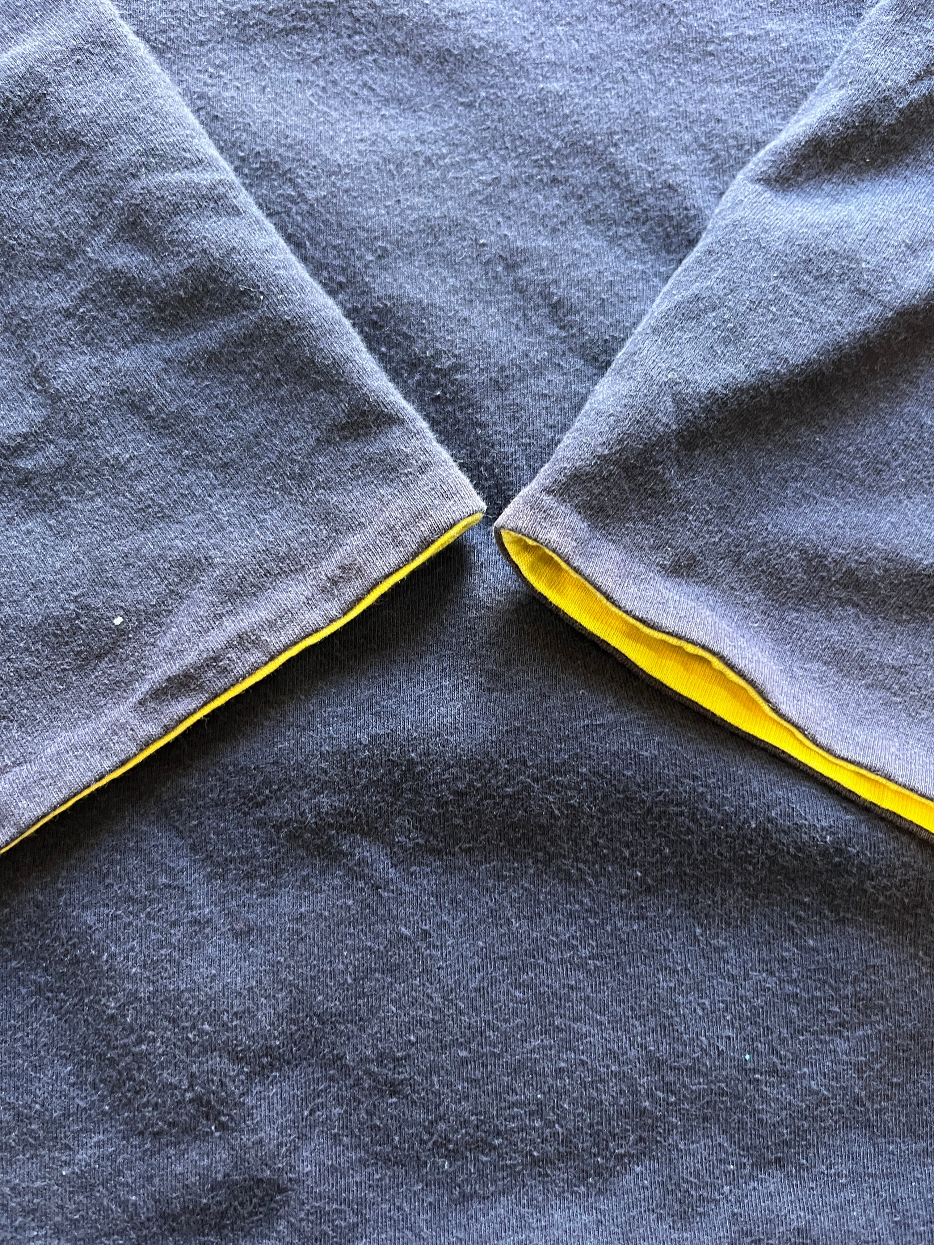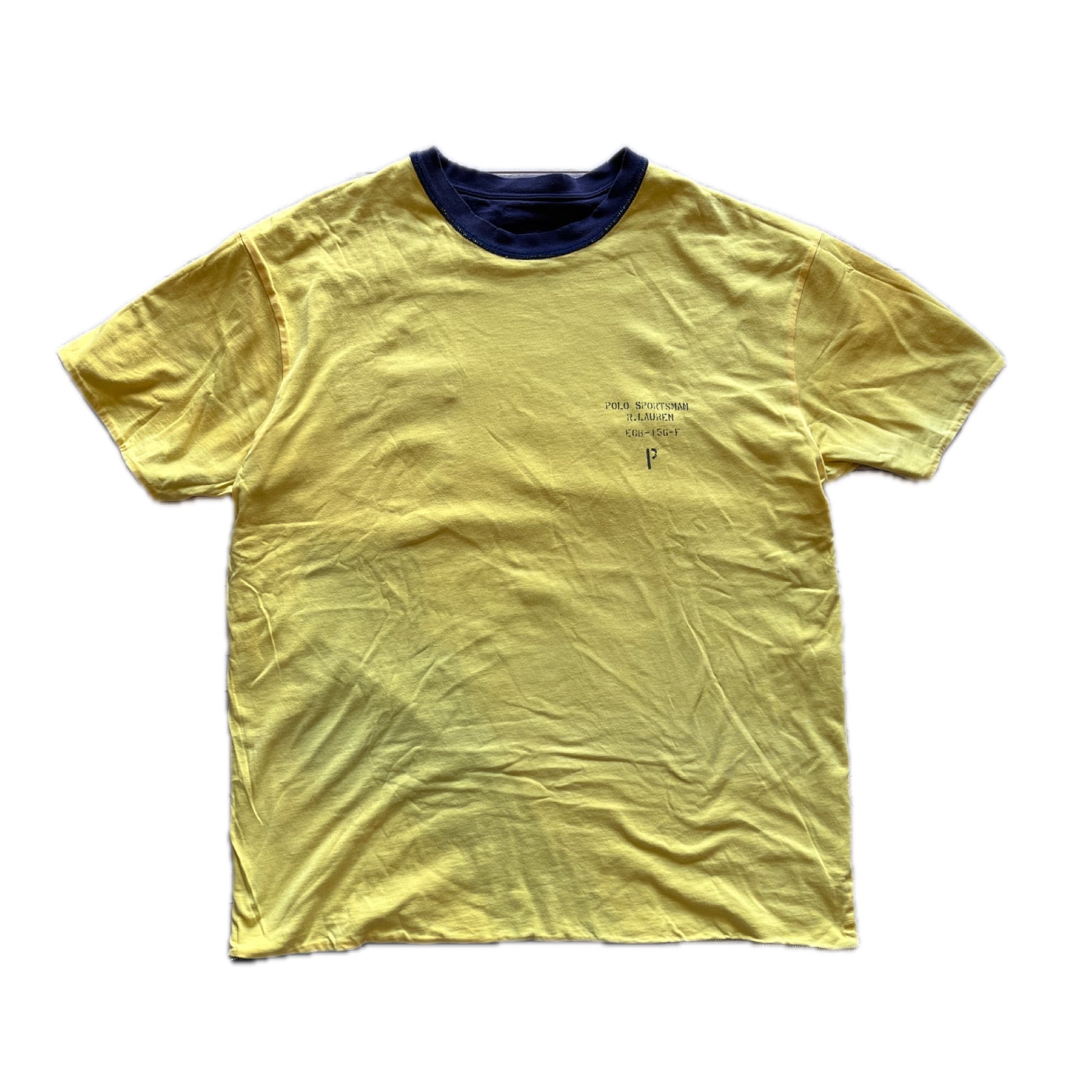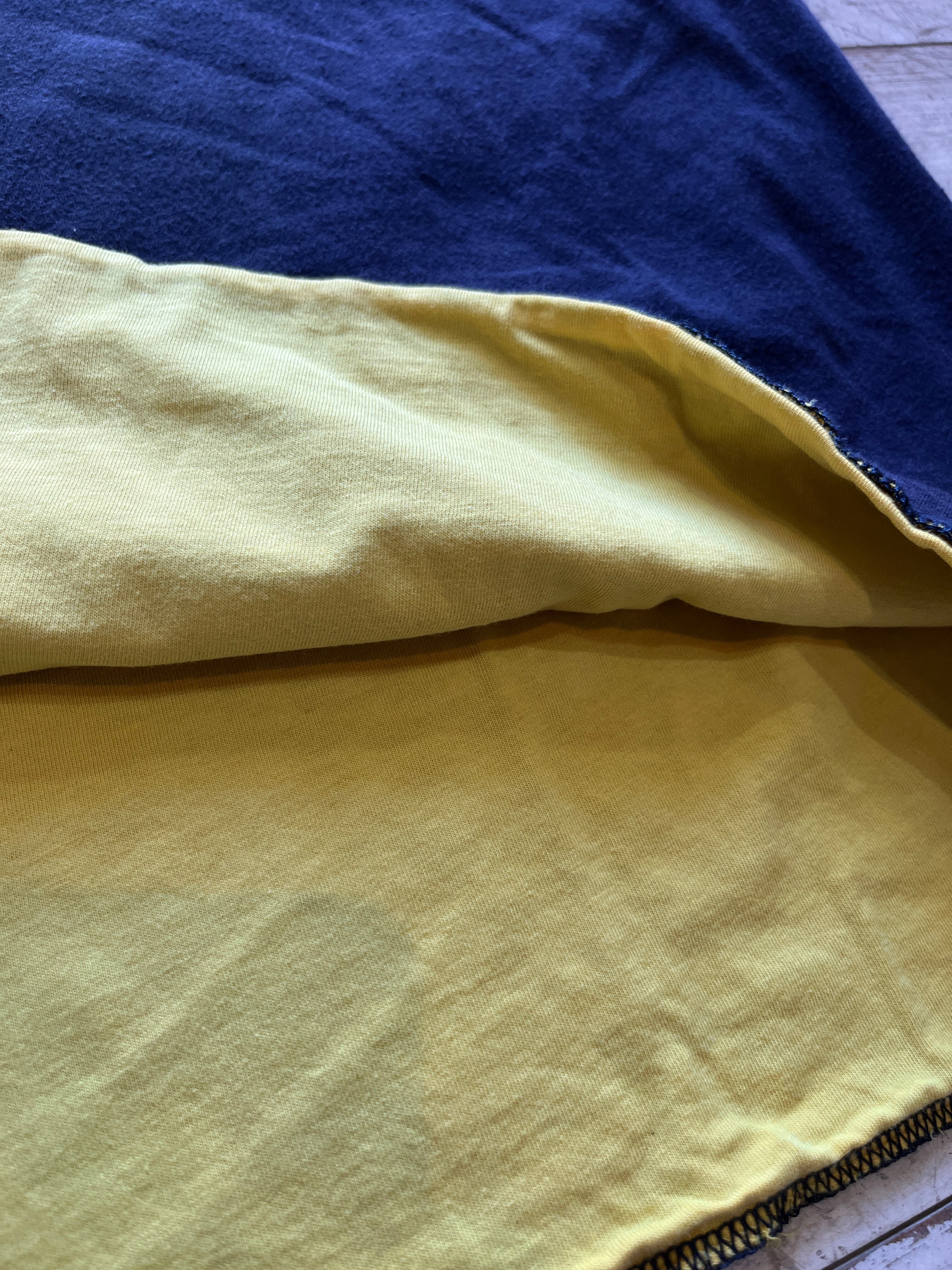 表は無地のネイビーポケット、裏は黄色に胸にステンシルが入って1枚。