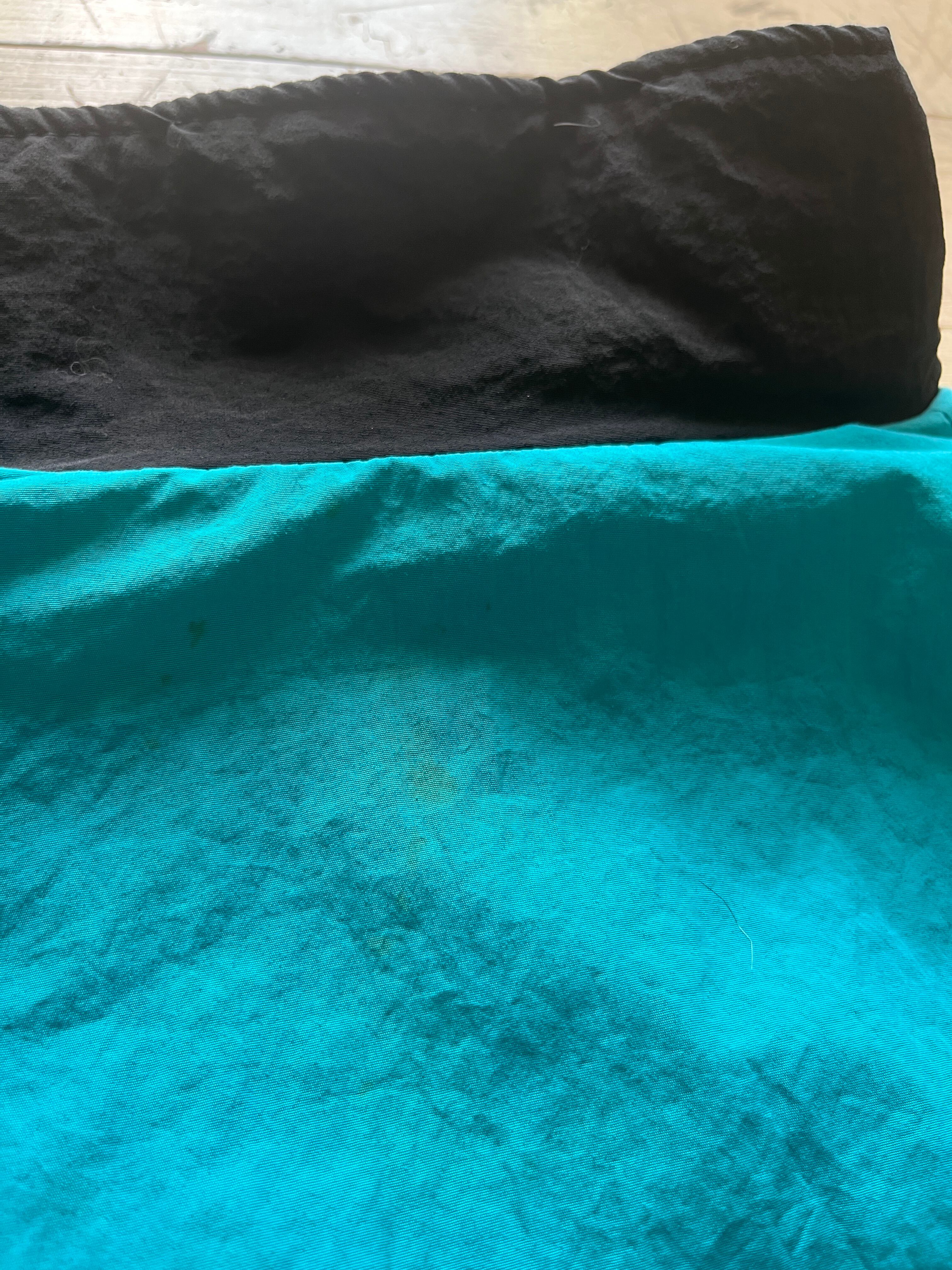 エメラルドグリーンと黒の切り返しで胸にワンポイント企業のプリント。
