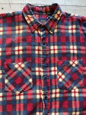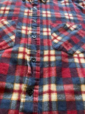 コットン100%の赤と紺がベースになっているプリントフランネルチェックシャツ。