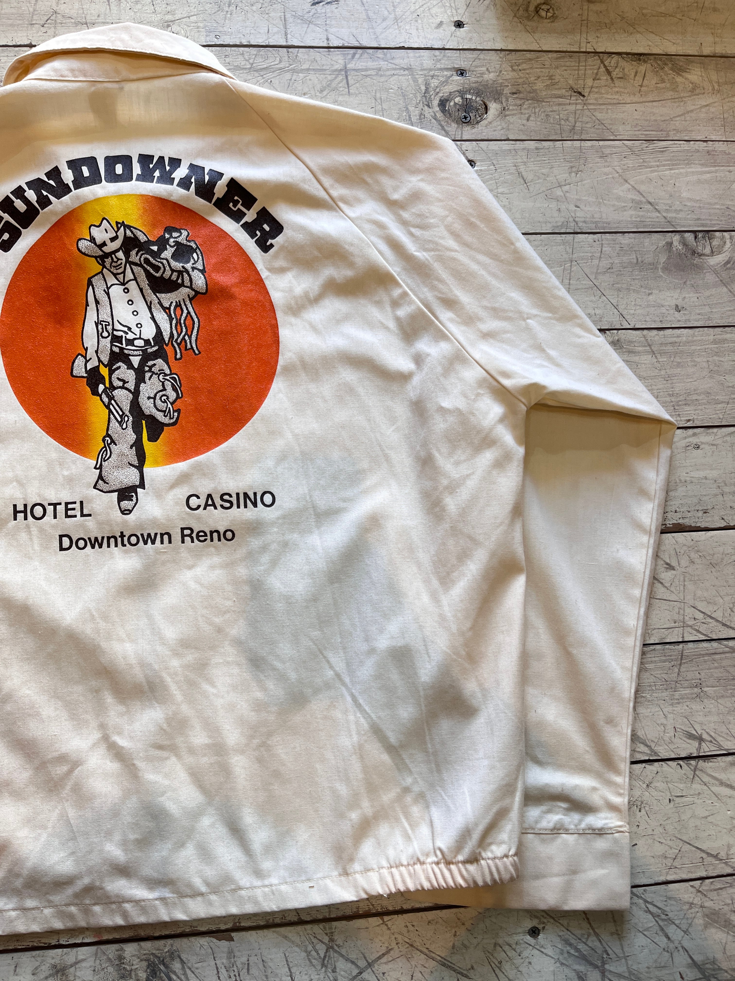 70〜80年代のスウィングトップジャケット。薄いクリーム色ボディーにネバダ州リノのホテルカジノのスーベニアらしきジャケット。