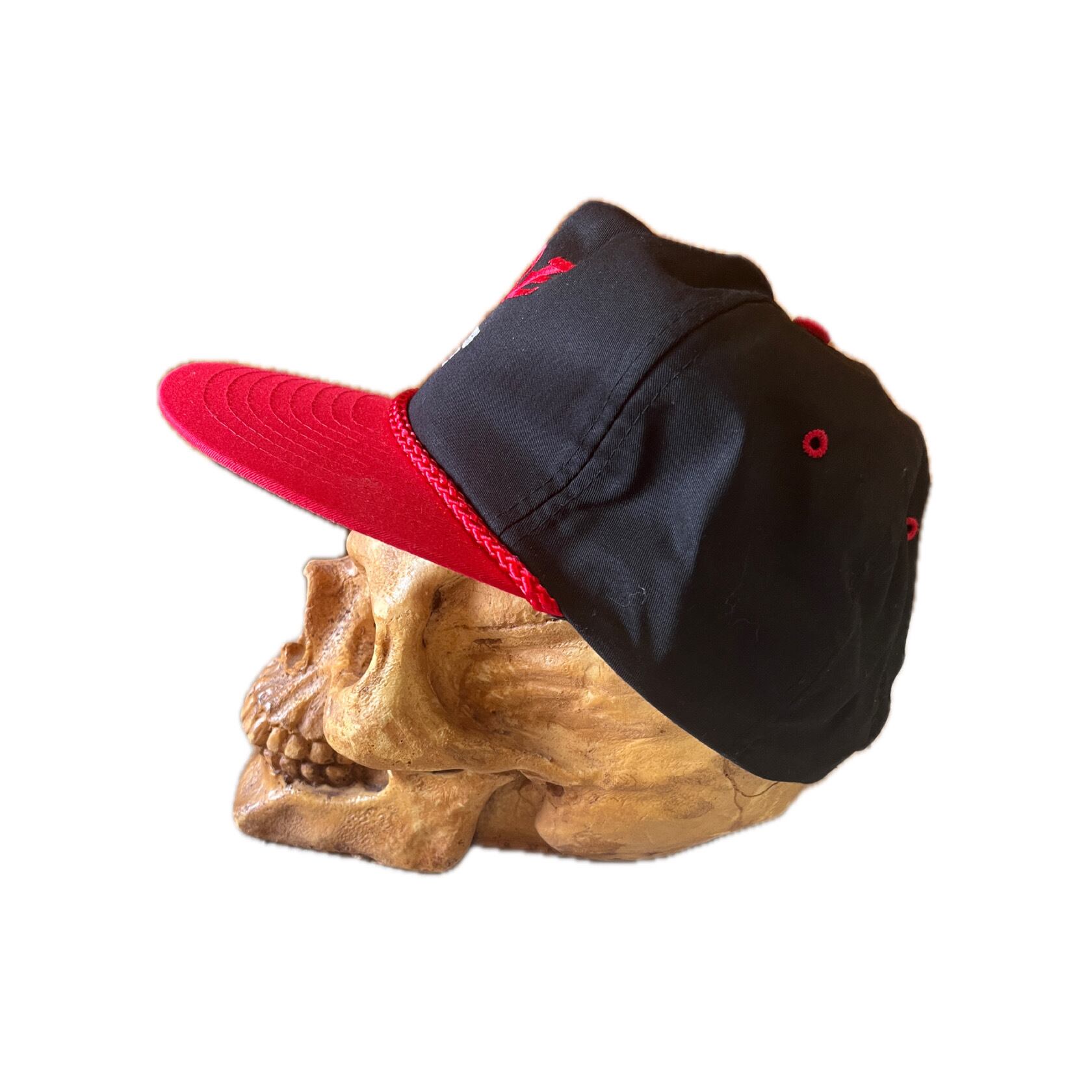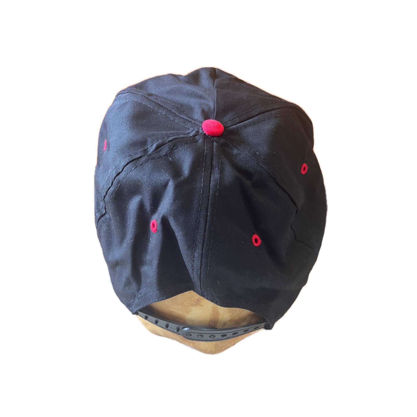 黒×赤のD.A.R.Eトラッカーキャップ。