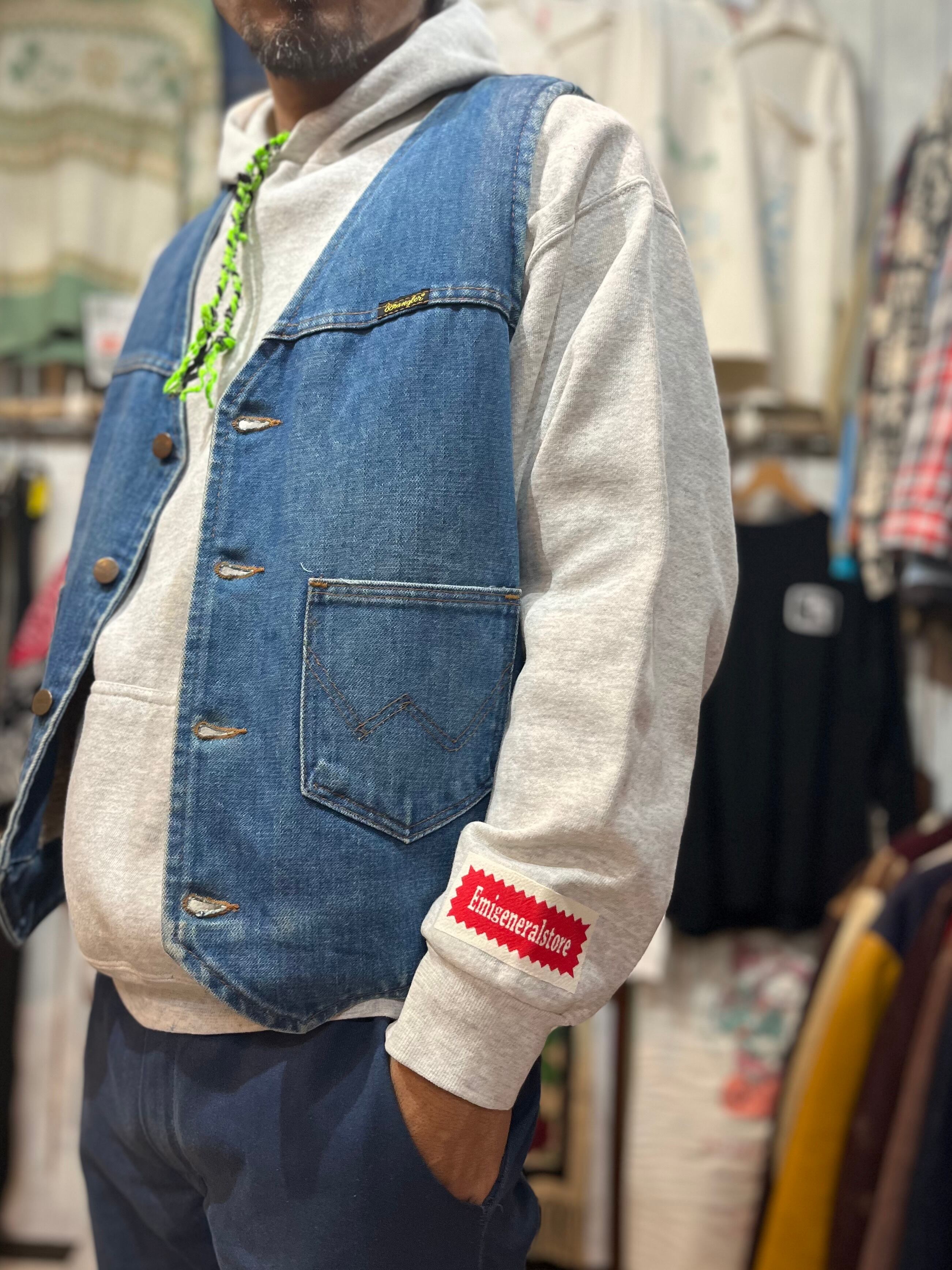 そこに当店オリジナルのバンダナを裂いて三つ編みした紐を付け、袖にオリジナルワッペンを付けた1点。
