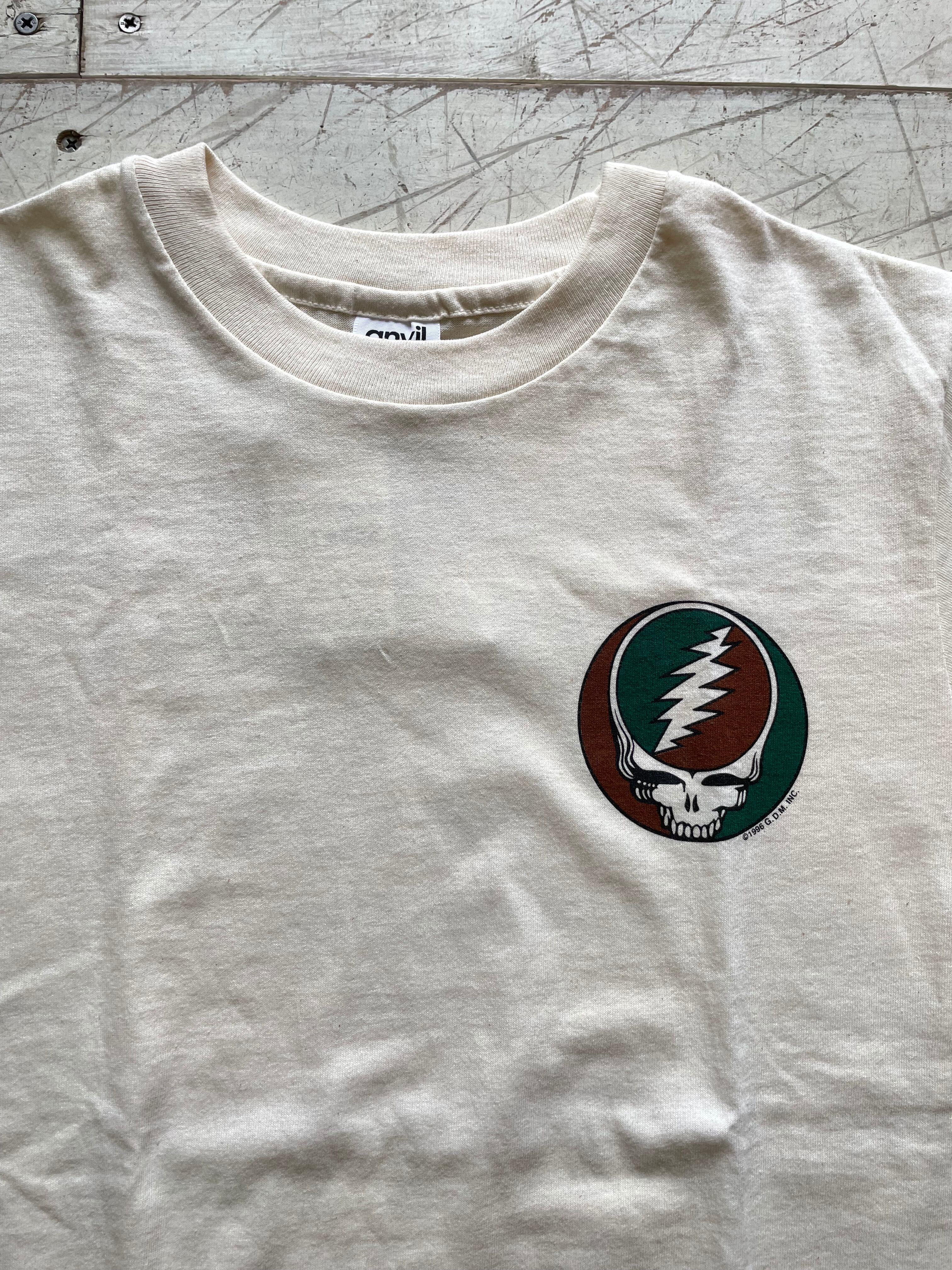 生成りボディにグレイトフルデッドのアイコンSteal Your Faceが胸にワンポイントあり、バックに30周年のアニバーサリーツアーの内容がプリントされております。